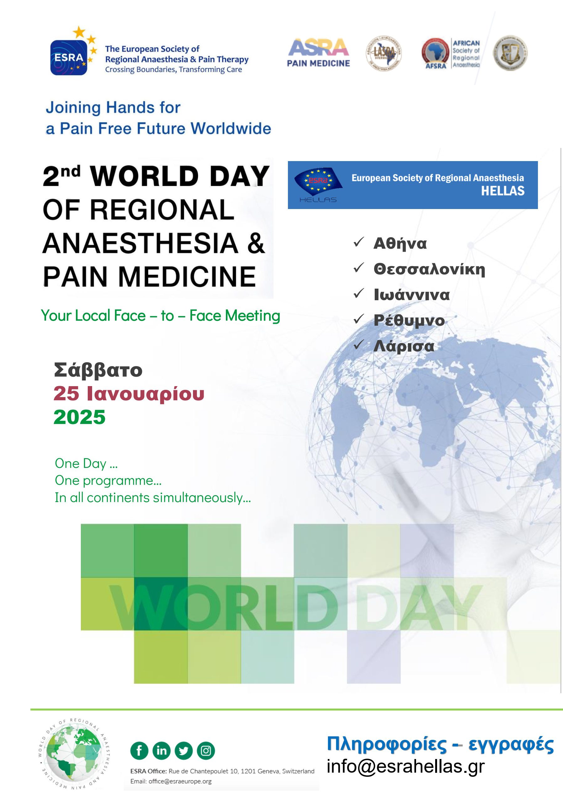 Η εγγραφή παρέχεται δωρεάν από το ΔΣ της ESRA Hellas προς τους Έλληνες και Κύπριους συναδέλφους, ενώ η μοναδική προϋπόθεση συμμετοχής είναι η εγγραφή ή η ανανέωση εγγραφής των συμμετεχόντων στην ESRA για το έτος 2025 (ESRA Europe – ESRA Hellas Joint Membership).